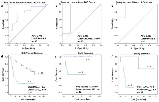 To determine the optimal cutoff value for each subgroup, the PET metric with the best discrimination between short- and long-term survival was selected, and ROC analysis yielded the following cutoffs: for ESFT an SUVmax of 5.5, for STS an SUVmax of 8.5 and for BS a volume of 127 cm3 (Figure 5a–c). The corresponding Kaplan–Meier graphs illustrate the significant difference in survival for the patients of the three subgroups using the above-mentioned cutoff values (Figure 5d–f).