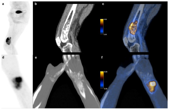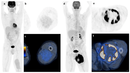 Bone sarcoma: Dedifferentiated chondrosarcoma of a 73 y.o. patient with a survival of 6 months (231.9 cm3) in the right distal femur (a) sagittal FDG PET maximum intensity projection (b) CT and (c) fused FDG PET/CT images. (d–f) Osteosarcoma in a 14 y.o. patient with a (60.1 cm3) of the right radius and a survival of at least 101 months.