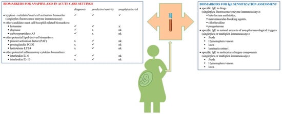 Biomarkers for anaphylaxis in pregnancy. Legend: ✓ = role known, x = not demonstrated; nk = not known; data adapted from [].