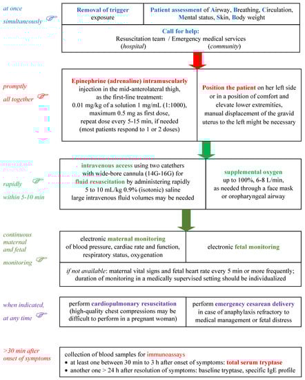 The treatment of anaphylaxis of pregnant patients in acute care settings is basically the same as that in non-pregnant ones and it is not currently guided by biomarkers. Moreover, there are no anaphylaxis biomarkers to help identify the onset of biphasic anaphylaxis in clinical settings []. Pregnant patients with anaphylaxis may require emergency cesarean delivery to avoid fetal hypoxemia and prevent severe fetus damage, but currently, there are no validated molecular biomarkers for this indication []. The negative neurologic outcomes of the fetus are mostly due to delayed caesarean delivery or inadequate doses of adrenaline during anaphylaxis [,]. Figure 2 presents the management of anaphylaxis in pregnancy, including the optimal moment for blood specimens collection for biomarkers in the timeline of the emergency procedure.