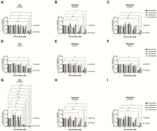 Influence of antiandrogens on the AR-mediated gene transactivation on androgen-dependent (LNCaP, LAPC4) and androgen-independent (C4-3) cell lines. To determine AR-mediated gene transactivation, modulation of mRNA levels of four AR target genes (PSA, TMPRSS2, PROSTEIN) were detected by qPCR and displayed as a mean change of 1 nM R1881. mRNA levels of AR target genes were normalized to the geometric mean of TBP and HPRT1. (A–C) Relative change of the AR target genes PSA (A), TMPRSS2 (B), and PROSTEIN (C) after 16 h of 1nM R1881 and Bicalutamide, Enzalutamide, Apalutamide, or Darolutamide treatment in the cell lines LNCaP. (D–F) Relative change of the AR target genes PSA (D), TMPRSS2 (E), and PROSTEIN (F) after 16 h of 1nM R1881 and Bicalutamide, Enzalutamide, Apalutamide, or Darolutamide treatment in the cell lines C4-2. (G–I) Relative change of the AR target genes PSA (G), TMPRSS2 (H), and PROSTEIN (I) after 16 h of 1nM R1881 and Bicalutamide, Enzalutamide, Apalutamide, or Darolutamide treatment in the cell lines LAPC4. Values are expressed as mean ± SEM of at least three independent experiments. All differences highlighted by asterisks were statistically significant (*: p ≤ 0.05; **: p ≤ 0.01; *** p ≤ 0.001).