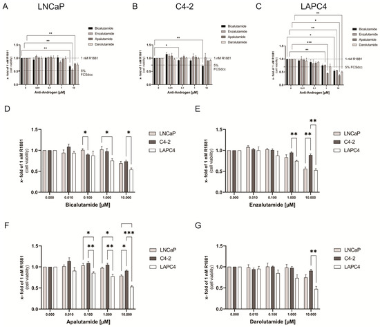 Comparison of the influence of the tested antiandrogens on cell viability reveals that the cell line C4-2 responded with the lowest and LAPC4 with the highest sensitivity to antiandrogen treatment (Figure 2D–G).
