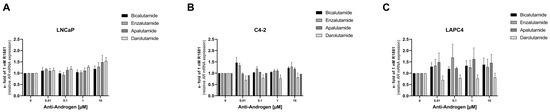 Methyltrienolone (R1881) (Sigma-Aldrich, R0908-10MG, Lot Number: 085M4610V), Bicalutamide (Selleck Chemicals LLC, Tokyo, Japan, S1190, Lot Number: 5), Enzalutamide (Astellas Pharma, Tokyo, Japan, 3343, Lot Number: RS-8BK0189-4), Apalutamide (Selleck Chemicals LLC, Tokyo, Japan, S2840, Lot Number: 2), and Darolutamide (Selleck Chemicals LLC, S75559, Tokyo, Japan, Lot Number: 1) were dissolved in DMSO as a 100 mM stock solution and stored in aliquots at −80 °C. As R1881 is not metabolized as rapidly as the natural 5α-dihydrotestosterone, it was used as androgen for the studies [23]. Competition Binding studies have revealed an IC50 of 160 nM for Bicalutamide and 21.4 nM for Enzalutamide in LNCaP cells [16]. In the presence of 0.45 nM of testosterone, AR luciferase reporter gene assays revealed for Enzalutamide an IC50 of 26 nM, for Apalutamide an IC50 of 200 nM, and for Darolutamide an IC50 of 26 nM [12]. In line with these IC50 values and previous studies, an antiandrogen concentration range of 0.01 µM to 10 µM was chosen [24,25].