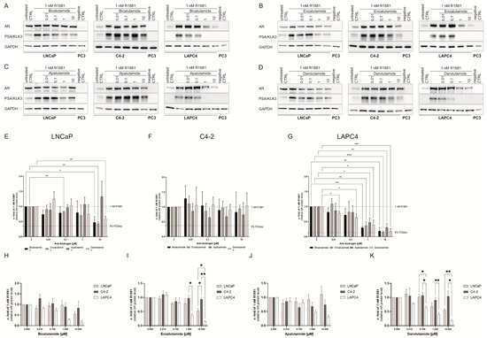 Influence of antiandrogen treatment on AR protein levels. (A–D) Representative western blots of AR protein, PSA, and GAPDH protein in LNCaP, C4-2, LAPC4, and PC3 after 1 nM R1881 and Bicalutamide (A), Enzalutamide (B), Apalutamide (C), or Darolutamide (D) treatment. PSA served as antiandrogen treatment control. PC3 cells were used as a negative control for PSA and AR. (E–G) Relative change of AR protein after treatment with 1 nM R1881 and Bicalutamide, Enzalutamide, Apalutamide, or Darolutamide in LNCaP (E), C4-2 (F), and LAPC4 (G). Cell line response comparison between LNCaP, C4-2, and LAPC4 cells of AR protein stability after treatment efficiency of Bicalutamide (H), Enzalutamide (I), Apalutamide (J), and Darolutamide (K). Changes in AR protein level have been assessed using western blot 72 h after treatment. Values are presented as relative values of 1 nM R1881 treated cells and expressed as mean ± SD of at least three independent experiments. All differences highlighted by asterisks were statistically significant (*: p ≤ 0.05; **: p ≤ 0.01; ***: p ≤ 0.001; ****: p ≤ 0.0001).