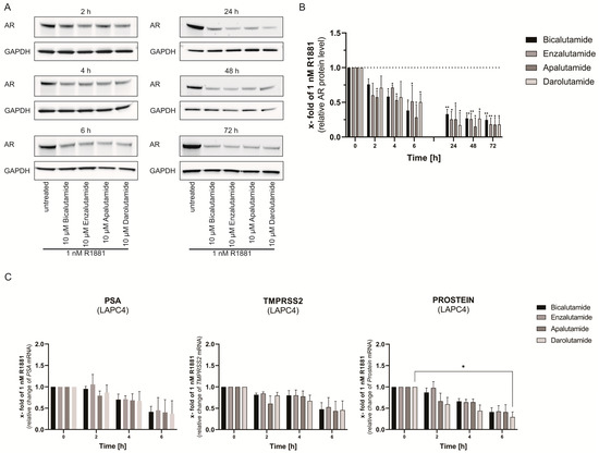 As changes in AR protein stability have been identified as an early event after Enzalutamide treatment, the influence of Bicalutamide, Enzalutamide, Apalutamide, and Darolutamide on AR stability was tested in shorter periods [25]. To assess the impact of antiandrogens on AR protein levels, LAPC4 cells were starved for 24 h followed by treatment with non-treatment, 1 nM R1881 treatment, and 10 µM of antiandrogens for 2, 4, 6, 24, 48, and 72 h. To determine changes in protein levels, western blot analyses on AR and GAPDH were performed (Figure 6A,B). Densiometric analyses revealed that all tested androgens induce an early AR protein reduction (Figure 6B). Apalutamide caused the first significant effects after 2 h, and Bicalutamide and Apalutamide after 4 h. Darolutamide showed the first significant effects on AR protein levels after 6 h. In contrast, reduction of the AR target genes PSA, TMPRSS2, and PSA are less prominent after 2 h and 4 h (Figure 6C). The first significant results on AR target genes were seen after 6 h of Bicalutamide treatment (Figure 6C).