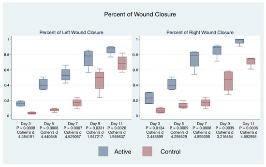 The statistical significance and effect sizes of comparisons of the left and right puncher wound closure between active cFIRB and control mice are demonstrated in