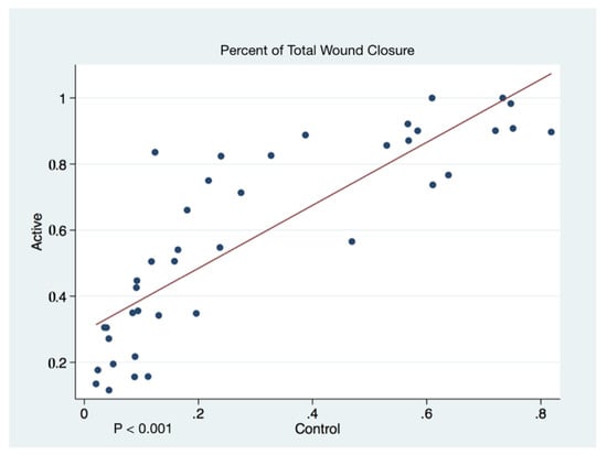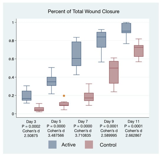 Wound closure percentages of the left and right puncher wounds were combined to give a total wound healing percentage for all animals’ closure. The higher rate of wound healing comparing active cFIRB treated and control animals is demonstrated with both statistical and substantive significance in
