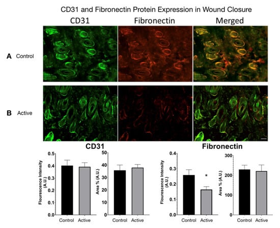 CD31 and Fibronectin Protein Expression were measured in active cFIRB treated and control wound closure mice. (