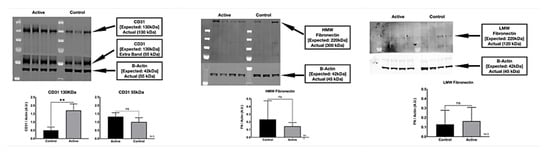 We detected two molecular weight isoforms for Fibronectin that included a high molecular weight (HMW) FN at 300 kDa and a lower molecular weight (LMW) FN at 120 kDa. For Fibronectin, there was no detected difference in protein expression with the treatment. On the other hand, cFIR treatment (active) appears to significantly increase the CD31 (platelet endothelial cell adhesion molecule) protein expression compared to untreated controls. The immuno-histological fluorescence was not as robust as the Western Blot for CD31. It did not demonstrate this difference, whereas it did demonstrate a significant difference in the Fibronectin that the Western Blot did not. (