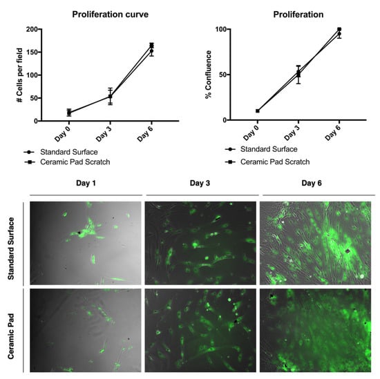 For the proliferation assay, the MSCs were sub-cultured at a density of 10,000 cells per well in triplicates, using tissue culture plastic plates of 12 wells plates and stained using the dye BODIPY (Thermo), according to manufacturer conditions. Cells were incubated at 37 °C with 5% CO2 using the MSC media described previously. We evaluated proliferation by placing one plate on a standard surface of the incubator and another plate over the ceramic-blanket surface inside the incubator. The experiment was conducted three times, n = 3. Three fluorescence and phase contrast photomicrographs for each of the three wells, plated with cells for each surface condition. were taken randomly using an inverted light microscope at days 1–6 for evaluation. Further, we counted the cells manually for each of the micrographs taken along the time points by opening the images with the image J server and evaluated the MSC proliferation, migration, and confluence.
