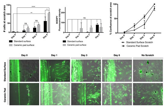 n = 3). The number of cells that migrated into the scratched area is significantly higher for cells cultured on the ceramic blanket than those cultured on a standard surface (