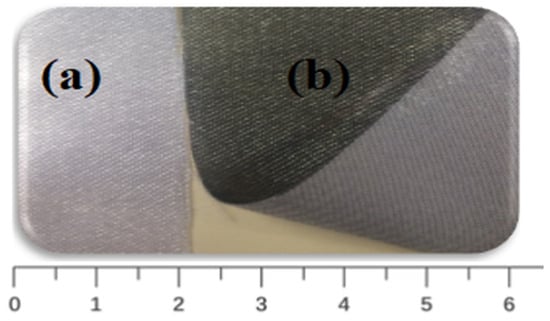 Digital photos of coated and uncoated GNPs–AgNPs’ nanocomposite films on one side of the planar surface of a silk textile substrate are shown in Figure 3.