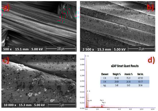 The samples were illuminated by reflected techniques and the images are directly viewed at 5× magnification, with a resolution of 500 µm, in order to provide a good textural shape. Scanning Electron Microscopy (SEM) images of the GNPs–AgNPs’ nanocomposite films on silk textile substrates are shown in Figure 5. The presence on the C layer and Ag-C composite layer of a large number of nanoparticles distributed over the surface of the coated substrate can be depicted with different magnification, as shown in Figure 5a–c.
