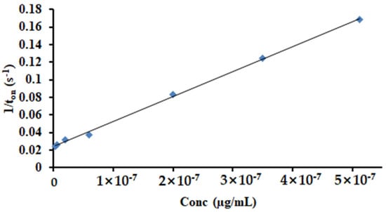 The response characteristic of the disposable stochastic sensor concerns that the signature of HGR-α was 1.4 s and the linear concentration range was between 4.10 fg mL−1 and 0.04 µg mL−1, with a sensitivity of 7.21 × 105 s µg mL−1 and a limit of quantification of 4.10 fg mL−1. The equation of calibration was 1/ton = 0.04 + 7.21 × 105 × C, (<C> = µg mL−1 and <ton> = s) (Figure 6) and the correlation coefficient r = 0.9998.
