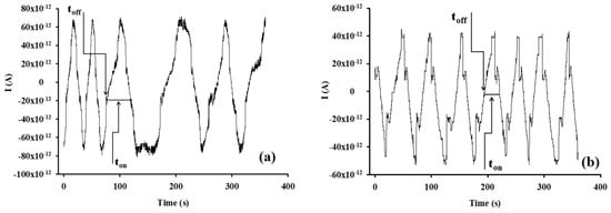 All measurements were performed using the stochastic mode at 25 °C. A potential of 125 mV vs. Ag/AgCl was applied. Diagrams containing toff and ton parameters were recorded (Figure 7). After the identification of HGR-α, by identification of its toff value, the value of ton was read in between two consecutive toff values. The ton value was connected with the concentration of HRG-α through the equation: 1/ton = a + b × CHRG-α. The equation of calibration was determined using the linear regression method. For the biological samples, the ton values were read in the diagrams and used the equations of calibration, and the unknown concentrations of HRG-α were determined.