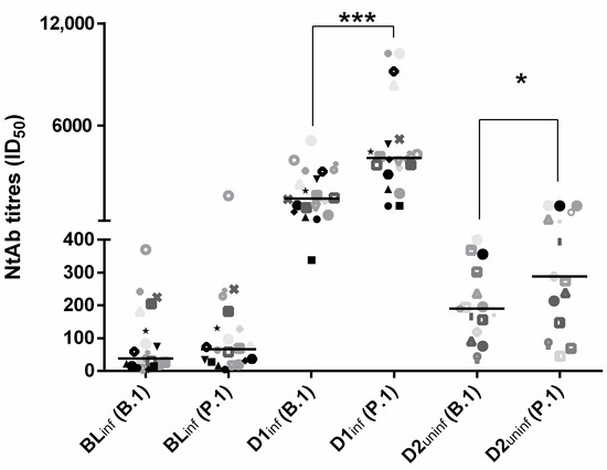 The uninfected group included HCW from the same region, had a median age of 49 (30–58) years with 67% females, and completed the two-dose vaccination schedule in January–February 2021. NtAb to the live virus belonging to the B.1 and P.1 lineages, as assessed by NGS (submitted to GISAID, accession number EPI_ISL_2472918 for P.1 and EPI_ISL_2472896 for B.1), were titrated in duplicate by testing two-fold serial dilutions of sera with 100 TCID50 of the corresponding SARS-CoV-2 strain in Vero E6 cells with automated measurement of cell viability by the Cell-titer Glo 2.0 system in a GloMax Discover luciferase plate reader (Promega, Madison, WI, USA) [13,14,15]. The NtAb titer (ID50) was defined as the reciprocal value of the sample dilution that showed a 50% protection from the virus-induced cytopathic effect. Each run included an uninfected control, an infected control, and the virus back-titration to confirm the virus inoculum. NtAb titers were expressed as median (IQR), and the non-parametric Wilcoxon signed-rank sum test and Mann–Whitney test were used to analyze changes in paired and unpaired data, respectively. Spearman analysis was used to measure the correlation between NtAb titers to the two viral strains. Analyses were run in IBM SPSS Statistics, version 20 (IBM Corp., Armonk, NY, USA) and all p-values were 2-sided.