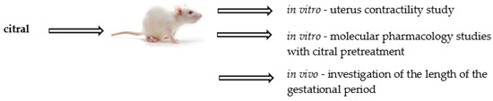 Figure 1 summarizes our experimental model. The rats got in vivo citral treatments and then their uteri were involved into in vitro studies. Additionally, a group of treated rats were allowed to deliver their pups to measure the effect of citral treatment on the length of gestational period.