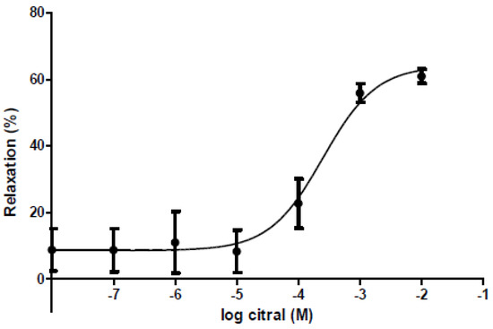 Citral (3,7-dimethyl-2,6-octadienal) is the major aromatic component of lemongrass oil. It is commonly used in daily life; for instance, as a flavor to intensify taste, or as a fragrance or as a repellent. It exhibits various pharmacological effects, such as a hepatoprotective effect in nonalcoholic fatty liver disease or an antimicrobial effect, but it also has immunomodulatory and antihyperalgesic effects [8,11,12,13]. Citral produces a relaxant effect on K+ and phenylephrine-induced contractions of isolated aorta rings in rats [14]. Furthermore, it is a well-known antagonist for TRPV4 [15].