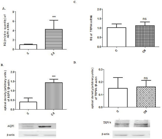 Changes in AQP5 mRNA (A) and protein (B, 35 kDa) and TRPV4 mRNA (C) and protein (D, 105 kDa) expression of on gestational day 22 in pregnant rat uteri after citral treatment, in vitro. β-actin (43 kDa) was used as a loading control. C: control uterus, Cit: citral-treated uterus, ns > 0.05; *** p < 0.001; compared to the control uterus sample. n = 6.