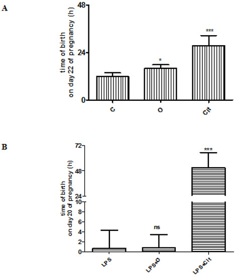 (A) Changes in the time of birth of normal pregnancy in C control, O: olive oil-treated and Cit: citral-treated rats. (B) Changes in the time of birth in bacterial lipopolysaccharide (LPS)-induced preterm birth, bacterial lipopolysaccharide and olive oil (LPS + O) or bacterial lipopolysaccharide and citral (LPS + Cit)-treated animals. ns > 0.05, * p < 0.05, *** p < 0.001; compared to the control or LPS-treated animals.