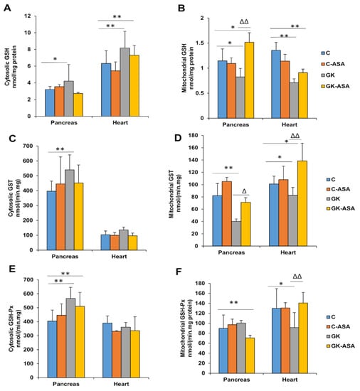 Glutathione levels and metabolism in the pancreas and heart of control Wistar and GK rats treated with aspirin (ASA) (n = 5). GSH concentrations in the pancreas and heart of control Wistar and GK rats were measured in the cytosol (A) and mitochondria (B) using the enzymatic recycling method of Griffith, as described in the Materials and Methods. GST activity, using CDNB as a substrate, was measured in the cytosol (C) and mitochondria (D). GSH-Px activity in the pancreas and heart of control Wistar and GK rats was measured in the cytosol (E) and mitochondria (F) using cumene hydroperoxide as a substrate and GSH-reductase activity was measured in the cytosol (G) and mitochondria (H) using GSSG/NADPH as a substrate. Values are means ± SD from three independent experiments. Asterisks indicate a significant difference. * p < 0.05 compared to control, ** p < 0.001 compared to control, ∆ p < 0.05 compared to GK, ∆∆ p < 0.001 compared to GK animals.
