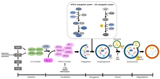 The overall autophagic process and the inhibitors targeting each step. Autophagy includes a multistep procedure: (1) initiation, (2) nucleation, (3) elongation, (4) fusion, and (5) degradation. AMPK and mTOR are major modulators of autophagy and ATGs are deeply associated with this procedure. When the autophagic process is initiated, ULK phosphorylates ATG13 and FIP200 are activated. In nucleation, ULK1 phosphorylates Ambra1, which interacts with Beclin-1, and Beclin-1 forms a PI3KC3 complex with other proteins. After that, cytoplasmic components are enclosed by the phagophore that is expanded to form autophagosomes. These double membranes are fused with lysosomes to form autolysosomes, and various cytoplasmic components are degraded by several enzymes in the autolysosomes. (AMPK: AMP-activated protein kinase; mTOR: mammalian target of rapamycin; ATG: autophagy related gene; ULK: Unc-51 like kinase; FIP200: Focal adhesion kinase family interacting protein of 200-kDa; PI3KC3: Class III phosphatidylinositol 3-kinase).