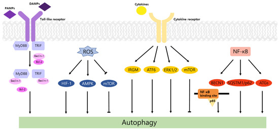 Toll-like receptors (TLRs) are immune regulators that modulate inflammatory response. They specifically recognize damage-associated molecular patterns (DAMPs) and pathogen-associated molecular patterns (PAMPs) by the innate immune system [14]. Then activated TLRs stimulate diverse transcriptional pathways by the myeloid differentiation primary response gene 88 (MyD88)-dependent or MyD88-independent process. Among them, nuclear factor-κB (NF-κB), mitogen-activated protein kinase (MAPK), and interferon-regulatory factors (IRFs) pathways are associated with the transcription of cancer-related genes that regulate tumor progression, including inflammation, proliferation, angiogenesis, and metastasis. In particular, the NF-κB cascade induces the expression of cytokines, including tumor necrosis factor alpha (TNF-α), interleukin-1 beta (IL-1β), and IL-6, which may cause tumorigenic inflammation [15]. TLRs also regulate the autophagic activity via MyD88- and Toll/IL-1 receptor domain-containing adaptor-inducing interferon-β (TRIF)-dependent pathways. The conjugation of these proteins and Beclin-1 to TLR4 separates the Bcl-2/Beclin-1 complex and triggers the development of autophagosome [14].