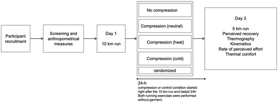 Compression and control garment conditions were randomized. On day 1, participants ran 10 km at their competitive pace. On day 2, they ran 5 km at the same speed as day 1, and the data were collected. Garments were provided after the end of exercise on day 1 and worn continuously for the following 24 h. Each garment condition was evaluated at least one week apart, and participants always used the same shoes. Running was performed without the garments. Figure 1 shows the experimental design.