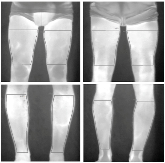 Skin temperature was determined before and immediately after each running session using a thermal infrared camera (E-60, 320 × 240 pixels, FLIR Systems Inc., Wilsonville, OR, USA) with Noise Equivalent Temperature Difference (NETD) < 0.05 °C, and measurement uncertainty of ±2 °C or 2%. To record the images, the camera was positioned 1 m away from the participant and with the lens aligned perpendicular to the body region of interest (ROI) and turned on 10 min before taking the images to ensure its stabilization. The images were recorded while the participant was standing up wearing underpants after a room thermal adaptation of 10 min. An anti-reflective panel was placed behind the participant to minimize the effects of infrared radiation reflected from the wall. All recommended procedures regarding environmental conditions (e.g., room temperature) and participant preparation regarding drinking alcohol or caffeine, smoking, using cosmetics, having large meals, using ointments, sunbathing, engaging in physical activity, and undergoing physiotherapy treatments were followed to minimize influence factors. The TISEM checklist was completed to certify that all the important protocol and thermographical analysis aspects were attended to [22]. Four ROIs were defined (anterior and posterior thigh and lower leg) in both lower limbs (Figure 2).