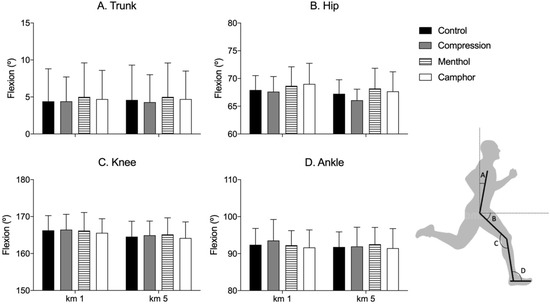 Mean (bars) and standard deviation (vertical lines) results of the sagittal plane kinematics found at different moments of the 5 km run (1st and 5th km) in the compression and control garment conditions. No differences were observed between garment conditions. The representation of the body angles indicates the trunk (A), hip (B), knee (C), and ankle (D) angles determined in the sagittal plane at the foot strike instant.