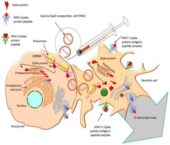 According to a non-COVID-19 related study in monkeys, mRNA gradually leaves the injection site (hours, days) and locates in nearby lymph nodes where it can effectively trigger the immune cascade that leads to the production of antibodies [49]. From the anatomical point of view, if the vaccine is injected in the upper arm (deltoid muscle), it would be expected that most of the particles in the vaccine would be drained into the axillary lymph nodes but mRNA would extend beyond the lymph nodes [29]. This phenomenon very likely explains why common local reaction to the vaccine is swelling and axillary lymphadenopathy [50]. In other words, due to their short lifespan, vaccine-contained mRNA is unable of self-replication and in turn, it undergoes rapid RNA degradation by both extracellular and intracellular RNases [51]. Accordingly, the nucleoside modifications of mRNA vaccines not only enhance the stability of RNA but also reduce the innate immune response [52].