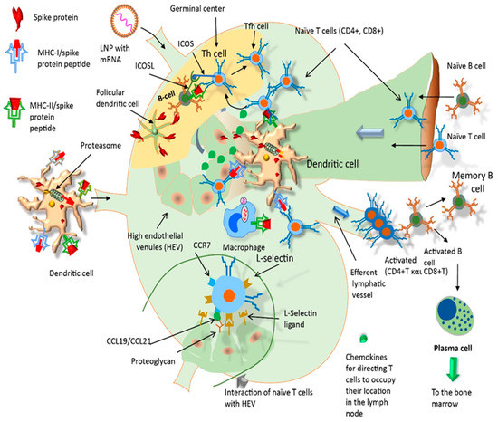 After intramuscular injection of mRNA vaccines, the released LNP-containing mRNA reach deeper tissue and can transfect muscle cells through endocytosis [61]. It is possible that mRNA will be translated to S protein inside the muscle cells. Shortly thereafter, antigen presenting cells (APCs, particularly dendritic cells and macrophages) are recruited to the site of injection such that most of the LNP containing mRNA is taking up by these cells. APCs then migrate to the lymph node nearest to the vaccination site (Figure 2). Passive drainage of mRNA–LNPs through lymphatic vessels allows for direct delivery of mRNA to the lymph nodes containing resident APCs within them, e.g., subcapsular sinus macrophages [62] (Figure 3).