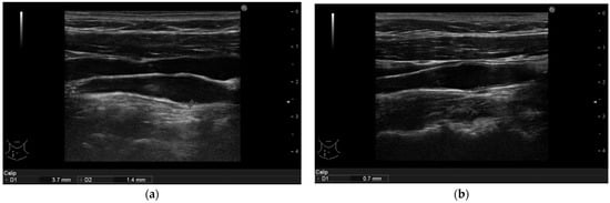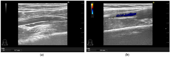 Disease severity and quality of life (QoL) outcomes were determined by three severity rating scales that are frequently used in dermatology: Psoriasis Area Severity Index (PASI), Dermatology Life Quality Index (DLQI), and EuroQol Visual Analogue Scale (EQ VAS) [23,24]. Before initiation of anti-IL-17 therapy, the severity of skin symptoms and the patients’ health-related quality of life were assessed with the use of these scales. Severe psoriatic patients (PASI > 10 and DLQI > 10) were enrolled. Moreover, patients were included who received ineffective topical and/or systemic treatment prior to anti-IL-17 treatment [25]. ‘High disease activity’ refers to ongoing systemic inflammation. Before the initiation of the applied therapy, there was an average 3 month “wash-out” period to minimalize the effect of the previously used treatment on the baseline IMT values. IMT was measured manually on longitudinal B-mode ultrasound images obtained with a linear array transducer (3–13 MHz; Hitachi Preirus Al Vision, Hitachi Medical Corp., Tokyo, Japan) by an experienced radiologist (KS). The sites of IMT measurement were the common carotid artery, the mid-third of the brachial artery, and the common femoral artery on both sides. Measurements were performed on the dorsal wall of the arteries, and for each artery, the highest IMT value was recorded. At the beginning of the study, no fIMT measurement was performed.