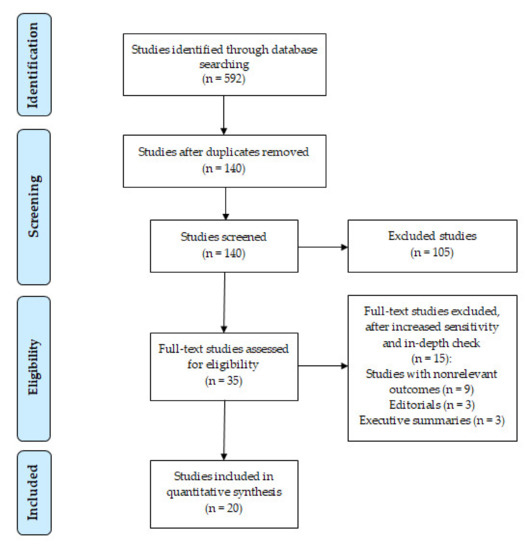 A search of electronic databases and scanning the reference lists yielded 592 relevant studies. After removing duplicates, 140 studies were screened. Based on the inclusion criteria, 35 studies were selected and screened for eligibility. In the end, 20 of them were included in the qualitative analysis. Figure 1 (the PRISMA flow diagram) shows the process of collecting suitable studies based on the predefined criteria.