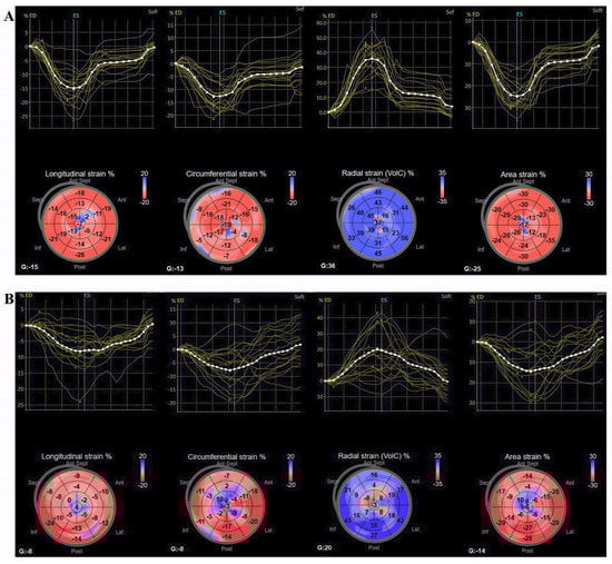 Representative cases of 3D-STE analysis. 3D strain parameters from two patients with anterior acute myocardial infarction and a LVEF of 48% (A) and of 42% (B), showing reduced strain values in the apical segments: GLS-3D, GCS-3D, GAS (negative, red colour), and GRS-3D (positive, blue colour) were simultaneously obtained. In the left bottom corner of each bull’s eye map, the global value is displayed for each parameter; 3D, three-dimensional; GAS, global area strain; GCS, global circumferential strain; GLS, global longitudinal strain; and GRS, global radial strain.
