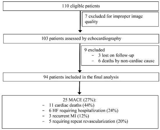 This study was conducted according to the guidelines of the Declaration of Helsinki and approved by Ethics Committee of “Iuliu Hațieganu” University of Medicine and Pharmacy, Cluj-Napoca under number 250 on 13 July 2020. We prospectively enrolled 110 patients with AMI, which were admitted in our Cardiology Department from July to August 2019. The diagnosis and treatment of AMI were performed in compliance with the European Guidelines of ST- and non-ST-elevation myocardial infarction (STEMI and NSTEMI) [1,2]. Patients with a previous MI, more than moderate valvular heart disease or moderate pulmonary hypertension, hypertrophic cardiomyopathy, and significant renal impairment (eGFR < 15 mL/min/1.73 m2) were excluded. All remaining patients underwent coronary angiography and were successfully revascularized by primary PCI. PCI was performed in patients with multivessel coronary artery disease (CAD) in later sessions. Echocardiography using traditional and 3D strain parameters was performed within the first 48 h after coronary angiography.