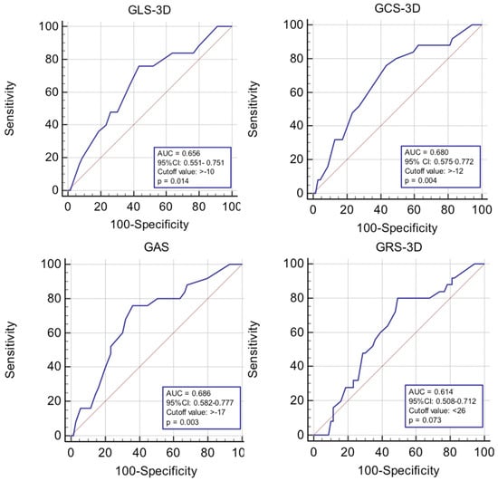 As concerning the accuracy of 3-STE parameters, different studies reveal variability of the obtained values and their accuracy [19,20,21,22,23,24]. As for example, in the case of GLS-3D, Ivahashi et al. [13] found higher specificity (Sp of 84% and Se of 83%), while Sugano et al. [21] found lower sensitivity (Se of 47% and Sp of 83%) comparing with our study. As related to GAS, similar with our study, Ali et al. [12] also found a high sensitivity (87.5%) for values > −17%, while Sugano et al. [21] found both high sensitivity and specificity, but the values were significantly less impaired. However, that study evaluated the patients at only 6 days after PCI.