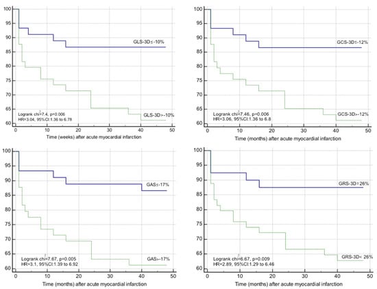 Kaplan–Meier curves for event-free survival showed a significantly higher rate of MACE in patients with GLS-3D > −10% (logrank p = 0.006, HR = 3.04, 95% CI: 1.36–6.78), GCS-3D > −12% (logrank p = 0.006, HR = 3.06, 95% CI: 1.36–6.8), GAS > −17% (logrank p = 0.005, HR = 3.1, 95% CI: 1.39–6.92), and GRS-3D ≤ 25% (logrank p = 0.009, HR = 2.89, 95% CI: 1.29–6.46), as shown in Figure 4.