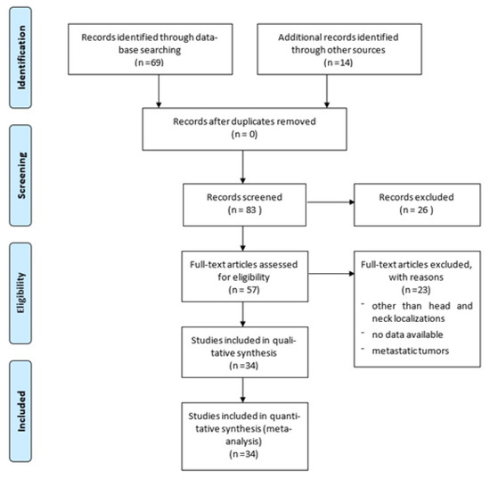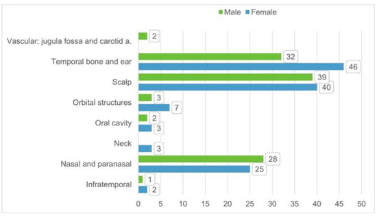 A total of 83 published studies were identified through PubMed, Web of Science, Google Scholar, and Scopus databases and additional reference list searches from 1979 to date. After a detailed examination of these studies, 49 papers were excluded from our review because they reported localizations other than head and neck or cases of metastatic tumors, or they had no data available. Patients’ demographics are reported in Table 1 [6,7,8,9,10,11,12,13,14,15,16,17,18,19,20,21,22,23,24,25,26,27,28,29,30,31,32,33,34,35,36,37,38,39]. The 34 published studies of this literature review include a total of 231 patients, 106 males (46%) and 124 females (54%), 1 patient not specified (0.4%), with a male/female ratio of 85% (106/124). The reported median age was 36 years (range 0.3–88). The patient distribution by sex and localization is reported in Figure 2.