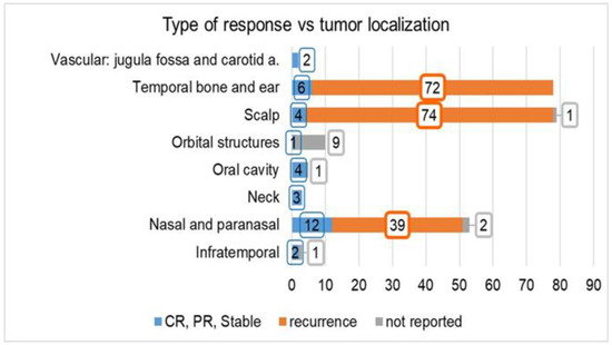 The distribution by type of response versus tumor localization is reported in Figure 3. A higher number of recurrences was observed in lesions located in the scalp (95% = 74/78 patients) and temporal bone and ear (92% = 72/78 patients), while in the lesions located in the nasal and paranasal areas, the rate of recurrence was 76% (39/51 patients). In the remaining localizations, the overall number of patients with a complete response was 12, while the patient outcome was not reported in 11 other patients.