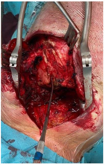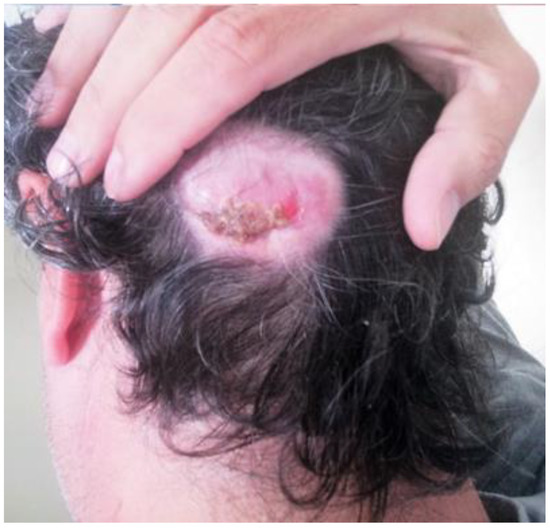A 45-year-old male was referred to our department complaining of a cutaneous posterior neck lesion, present since birth, characterized by a callous appearance and superficial protuberance, with a diameter of 4 cm × 3 cm and a thickness of 2 cm (Figure 4). Since the lesion was asymptomatic, the patient had decided not to perform any medical investigations in youth. The lesion did not show any modification over time, but it presented a superficial infection, managed with medication. Then, he decided to perform a radiological imaging study.