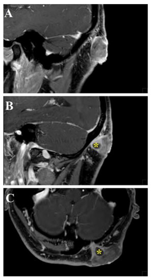 Head and neck MRI sagittal (A,B) and axial (C) images showed a cutaneous mass characterized by homogeneous post-gadolinium enhancement, isointense in T1-weighted sequences, with a characteristic sinus-like propagation that connected the tumor with the cerebellar dura mater through a small passage in the left occipital bone (yellow asterisks).