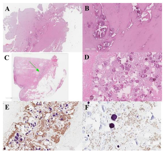 Meningeal fistulous tract of the cervical cutis, represented by fibrous tissue infiltrated by meningioma with psammomatous bodies (A,B). Dermo-hypodermic localization of predominantly fibrous meningioma with WHO grade I psammomatous bodies (green arrow) (C,D). Immunostaining was positive for EMA (E) and progesterone (F).
