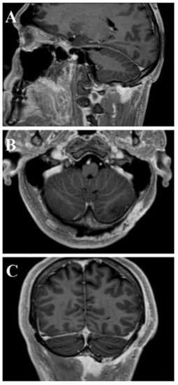 Post-operative head and neck MRI T1-WI with Gadolinium—sagittal (A), axial (B), and coronal (C) areas showed absence of residual tumor.