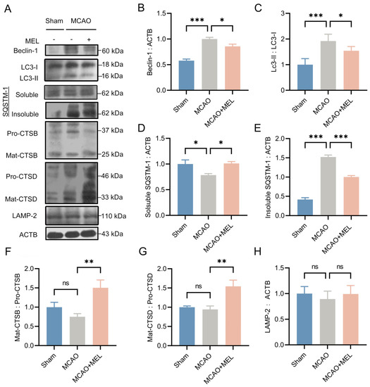 MEL greatly restored the autophagic/lysosomal dysfunction after ischemic stroke. MEL treatment prominently decreased the ratio of LC3-II/LC3-I (A,C) and Beclin-1 (B) expression at the ischemic penumbra. Meanwhile, MEL significantly reduced the autophagic substrate of insoluble SQSTM-1(D,E). This decreased SQSTM-1 might be elicited by the reinforced lysosomal activation (F) and its degradative activities of CTSB (G) and CTSD (H). MCAO, middle cerebral artery occlusion. MEL, melibiose. CTSB, cathepsin B. CTSD, cathepsin D. n = 6, * p < 0.05, ** p < 0.01, *** p < 0.001, ns indicates that the data are not statistically different.