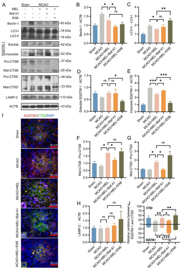 The MEL-ameliorated autophagy flux was achieved mainly by reinforcing the lysosomal capacity after MCAO/reperfusion. MEL treatment significantly inhibited autophagic activity (A–C), which likely decreased the generation of autophagic cargoes (D,E). Meanwhile, MEL markedly reinforcing the lysosomal activities of CTSB (F), CTSD (G), and LAMP2 (H), which necessarily promoted the degradation of autophagic substrates. Immunofluorescence (I) also indicated that MEL could promote CTSD expression and simultaneously attenuated the autophagic substrate of SQSTM-1 (J). Thus, the autophagy flux was prominently ameliorated by MEL treatment. However, the effect of MEL to ameliorate autophagic/lysosomal signaling was greatly counteracted by lysosomal inhibitor Baf-A1. Conversely, MEL-improved autophagy flux was further facilitated by EN6. n = 6, * p < 0.05, ** p < 0.01, *** p < 0.001, ns indicates that the data are not statistically different.