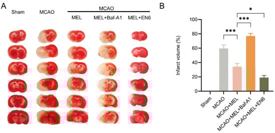 MEL treatment prominently attenuated the infarct volume after ischemic stroke. MEL treatment could significantly reduce the infarct size after ischemic stroke (A). However, this effect was greatly abolished by lysosomal inhibitor Baf-A1 (B). n = 6, * p < 0.05, *** p < 0.001.