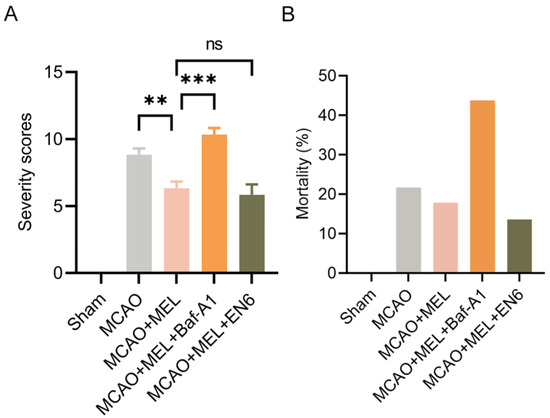 Neuroprotective effects of MEL was evaluated by mNSS test and animal mortality. MEL treatment effectively alleviated the neurological deficit (A) and animal mortality (B) after the MCAO/reperfusion. However, MEL-elicited neuroprotection could be greatly counteracted by lysosomal inhibitor Baf-A1. n = 6, ** p < 0.01, *** p < 0.001, ns indicates that the data are not statistically different.