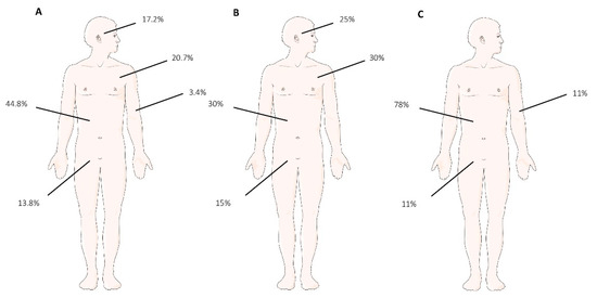 Of the 29 patients, the median age was 72 years of age (range 41–89); most of the patients were male (20 males, 9 females). Out of the reported cases, 20 out of 29 cases presented as a single skin lesion (70%), 6 of which occurring in the abdomen (6/20; 30%), 6 occurring in the thoracic skin (6/20; 30%), 3 occurring in the perineum (3/20; 15%), and 5 occurring in the facial skin (5/20; 25%). A total of 9 out of 29 (30%) patients presented multiple skin lesions, 7 of which occurred in the abdomen (7/9; 78%), 1 of which occurred in the perineum (1/9; 11%), and 1 of which occurred in the arm (1/9; 11%). A total of 13 out of 29 cases (45%) were localized in the abdominal skin; 6/29 cases (20%) were localized in the thoracic skin; 5/29 cases (17%) on facial skin; 4/29 cases (13%) were localized in the perineum; and 1/29 case (5%) was localized on the arm (Figure 1).