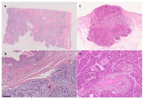 (A,B) Mucinous component in cutaneous metastasis from CRC ((A) H&E 0.5X; (B) H&E 25X). (C,D) Squamous component in facial skin metastasis from adenosquamous CRC ((C) H&E 0.5X; (D) H&E 20X).